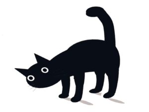 あと 3けんの うちを まわって、おなかが はちきれそうになり、うちに かえった ニャーロット。ねこドアに おなかが ひっかかって うごけません。