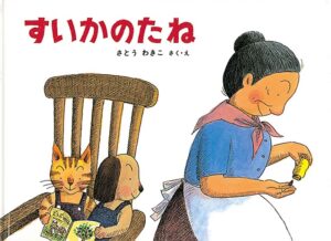 夏はこの絵本!『すいかのたね』です。ばばばあちゃん、大事にたねをひとつぶ埋めました。ところが、何かいいものかな?と思ったいぬ、ねこ、うさぎ、きつね、あげくには埋めたことを忘れたばばばあちゃんまでが、掘り返しては「なんだ」とか「つまらん」なんて言うもんだから、言われたたねは怒り心頭。ばばばあちゃんに売られたケンカを買い、ぐんぐん伸び始め、あたり一帯、悪態をつくすいか畑になります。ま、うるさくても、すいかは美味しい果物です。